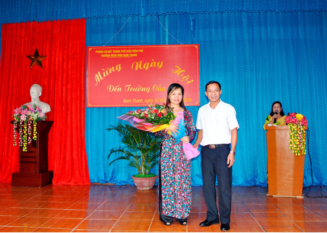 Đồng chí Phó chủ tịch phường Nam Thanh tặng hoa cho nhà trường